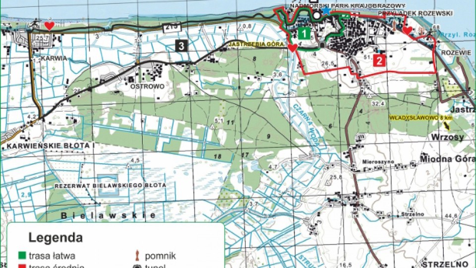 Leśną ścieżką w stronę Karwi - wydma (15 m n.p.m.) - przekroczenie ujścia Czarnej Wody - punkt pomiaru tętna w Karwi - wzdłuż drogi (nr 215) 2 km marsz chodnikiem - gruntową drogą w kierunku Ostrowa - przekroczenie ujścia Czarnej Wody - punkt pomiaru tętna - połączenie z zieloną trasą - tunel pod ul. Pucką - dojście do drogi nr 215 - Nadmorski Bulwar.