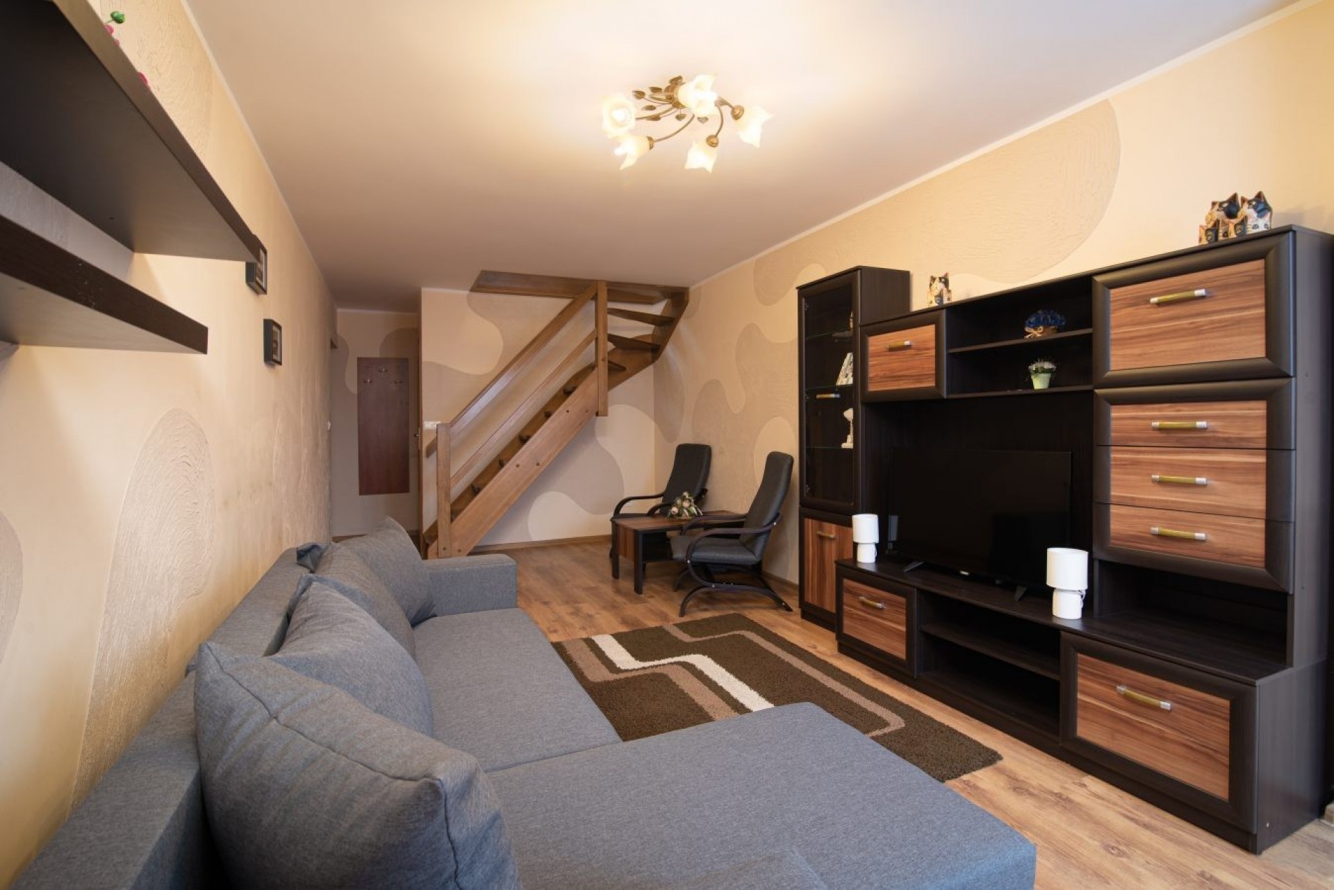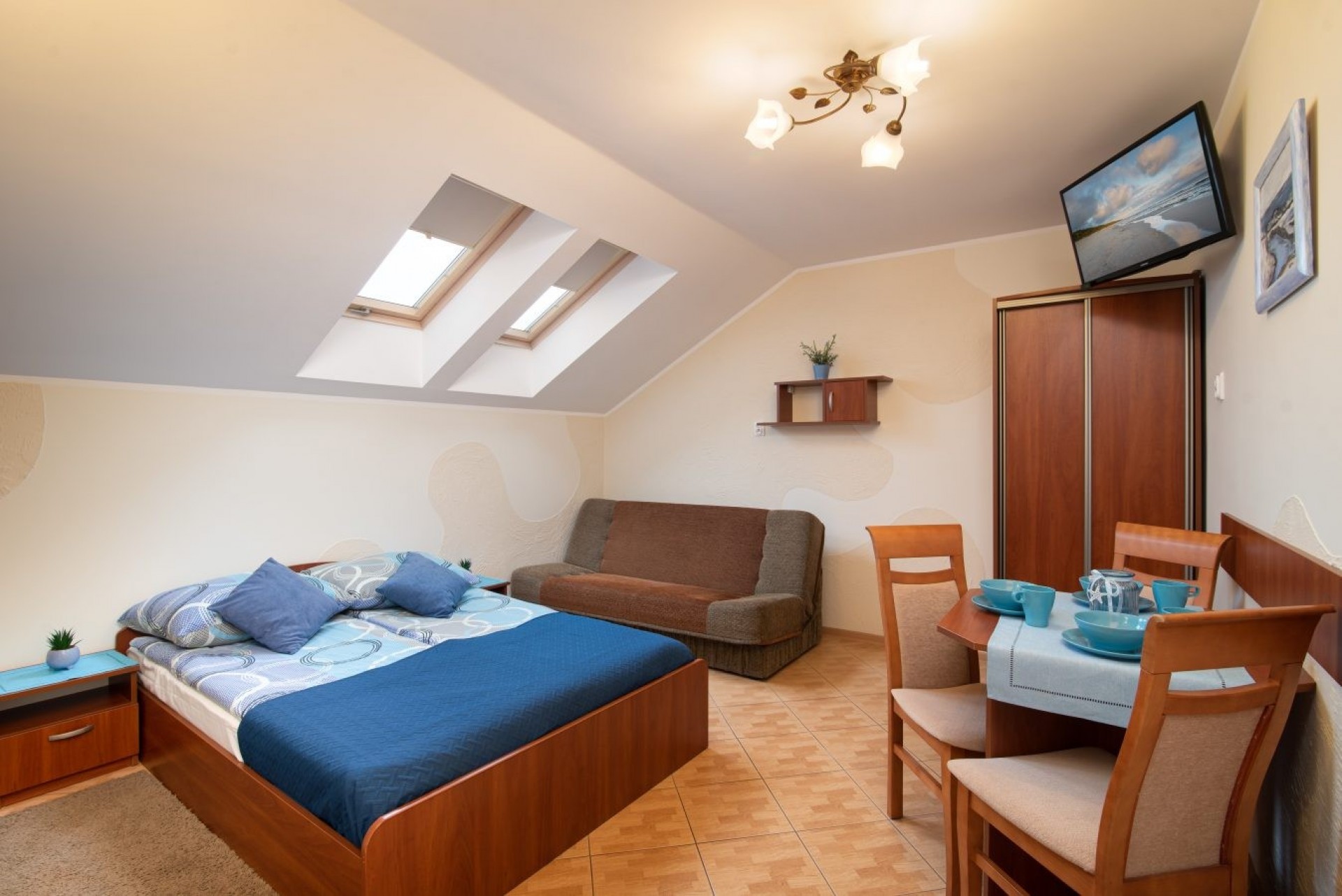 ** Kompleks składa się z pokoju dolnego z kanapą dwuosobową oraz górnego z dwiema kanapami dwuosobowymi. Łazienka znajduje się w dolnym pokoju, a aneks kuchenny w górnym pomieszczeniu.