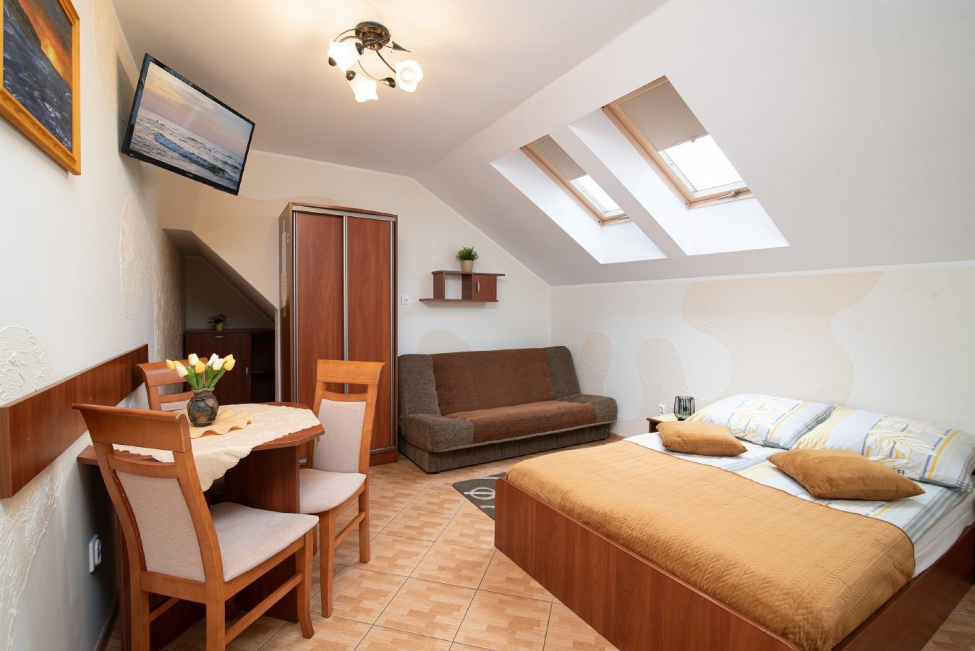 - domek nr 1 i 3 (max. do 6 osób). Domek składa się z pomieszczenia dolnego z rozkładaną sofą, aneksem kuchennym, łazienką i telewizorem oraz dwóch górnych pokoi: pokoju z łożem oraz pokoju z dwoma pojedynczymi łóżkami. W każdym z pokoi znajduje się telewizor;