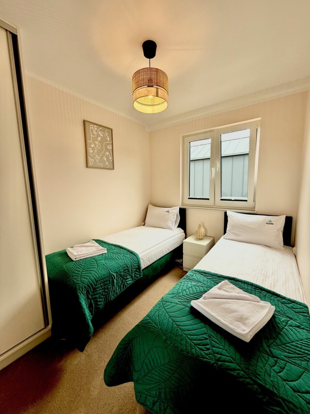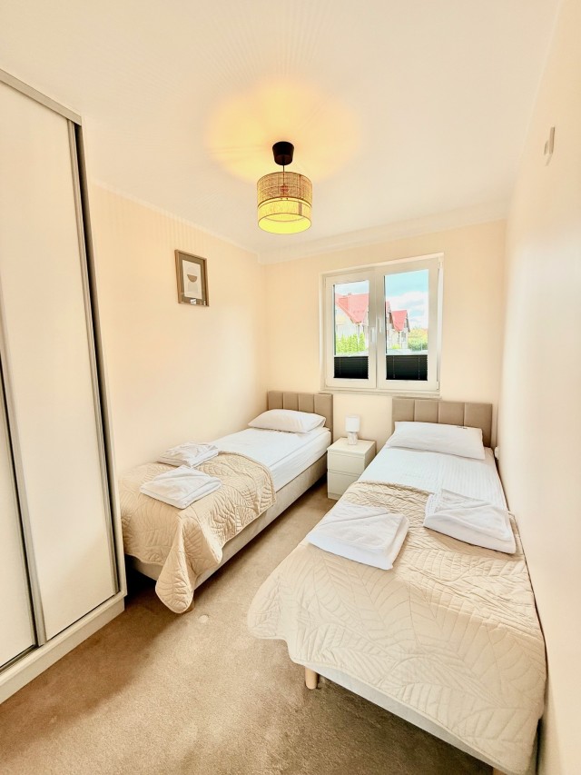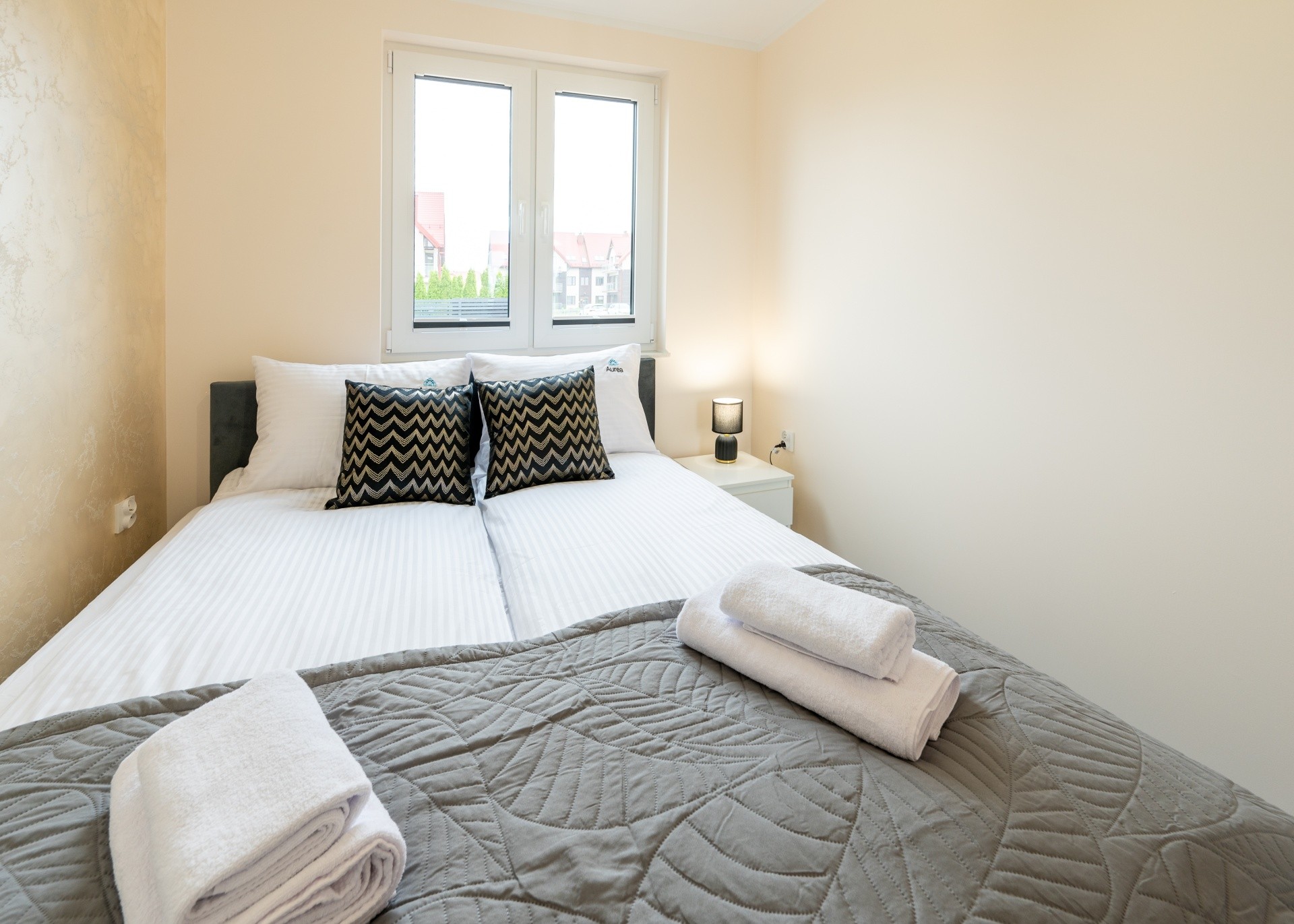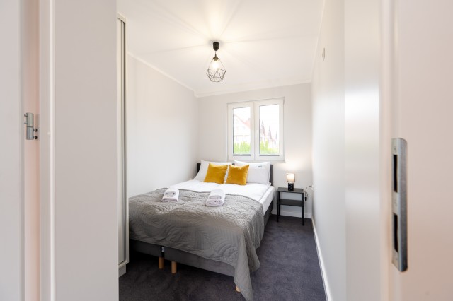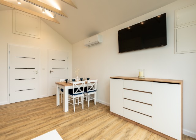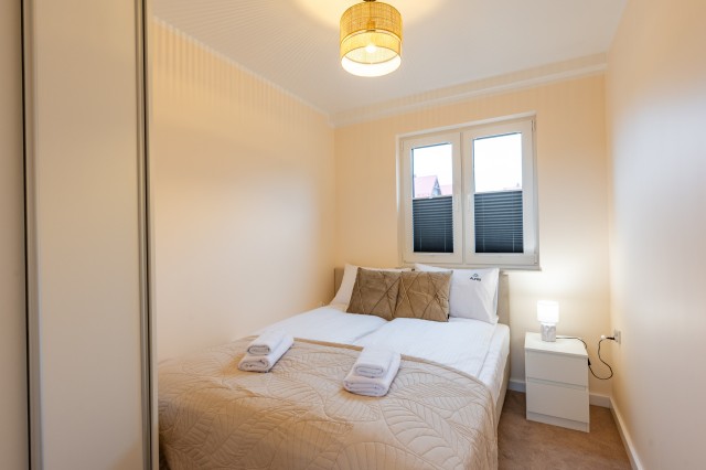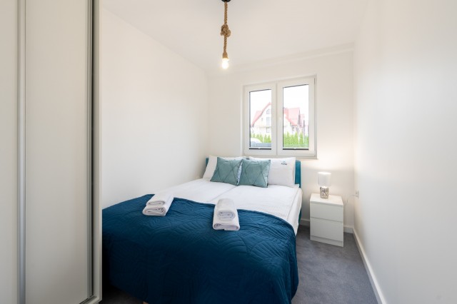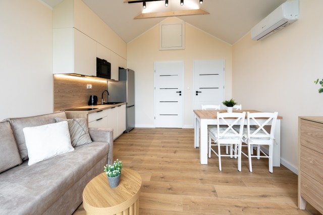Domek dysponuje 1 sypialnią z szafą oraz łóżkiem małżeńskim 160x200 z możliwością rozłączenia na dwa pojedyncze 80x200, łazienka z prysznicem oraz salon z aneksem kuchennym jadalnią oraz częścią wypoczynkową. Kanapa w salonie z funkcją spania 145x200.