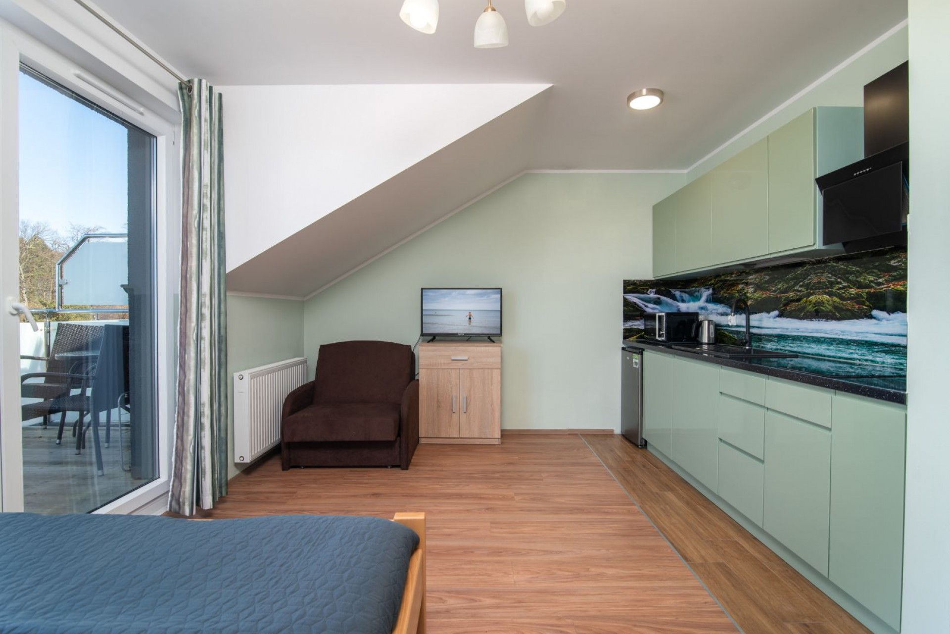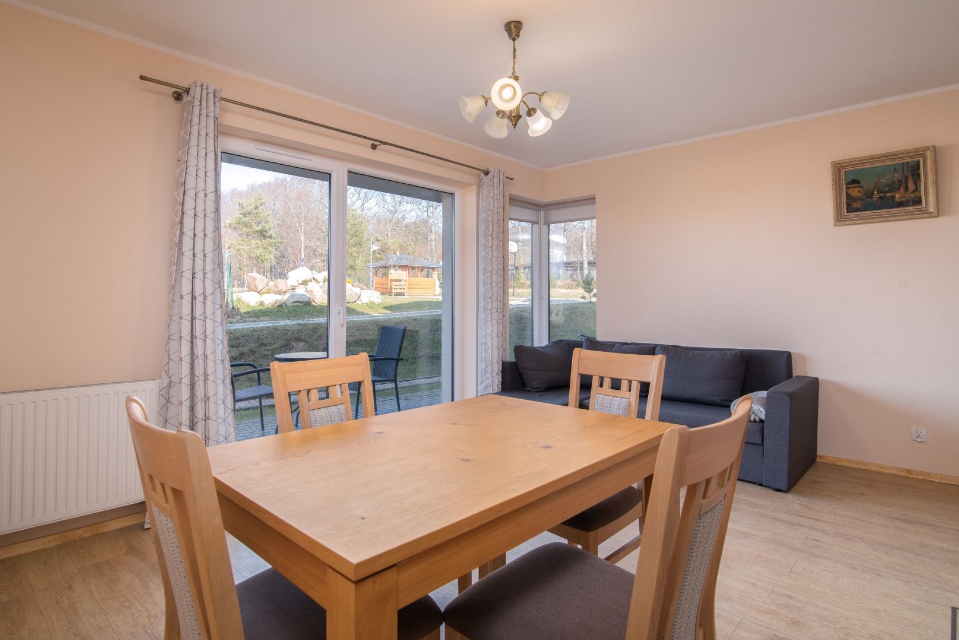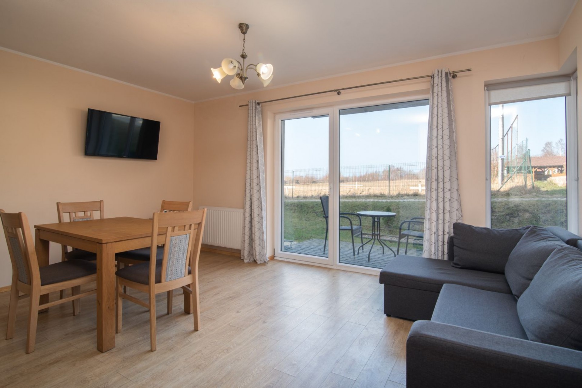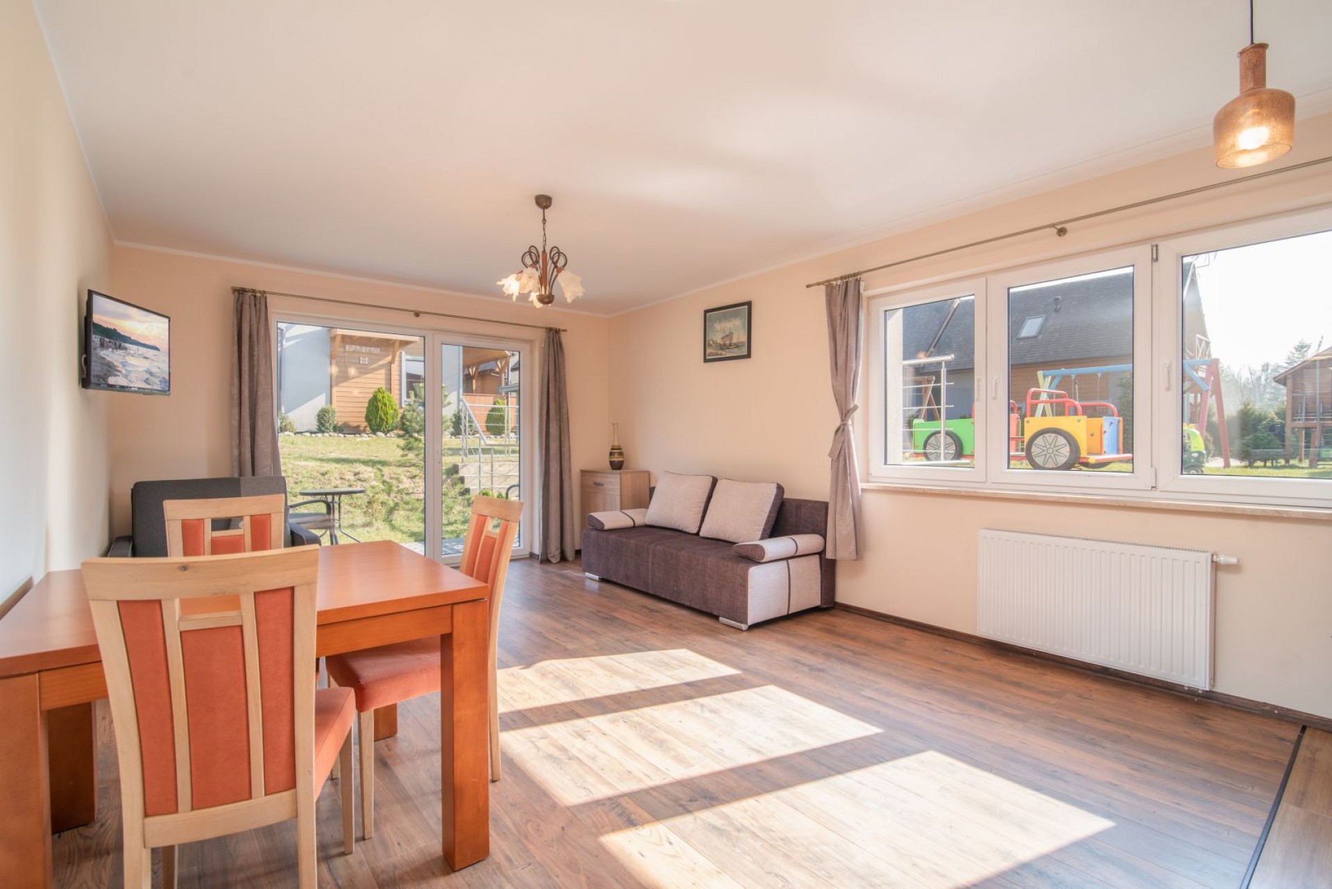 Każdy z domków składa się z dwóch pięter; na parterze znajduje się pokój dzienny z rozkładaną kanapą, która zapewnia możliwość noclegu dla 2 osób oraz aneks kuchenny.
