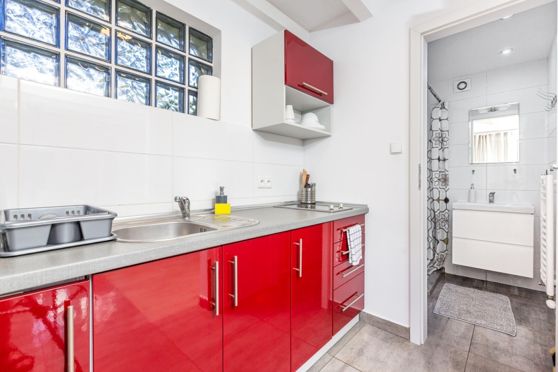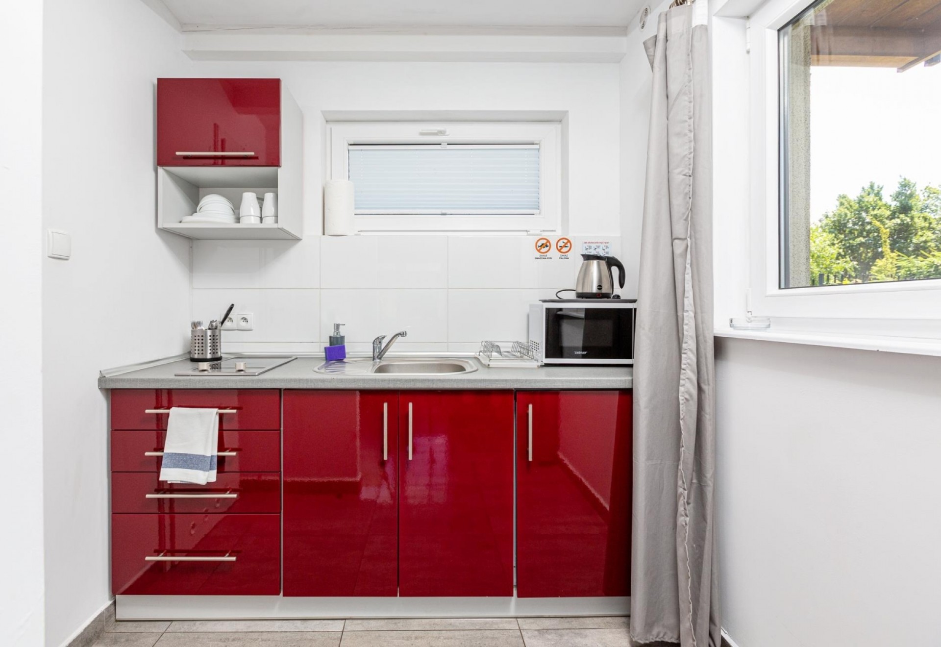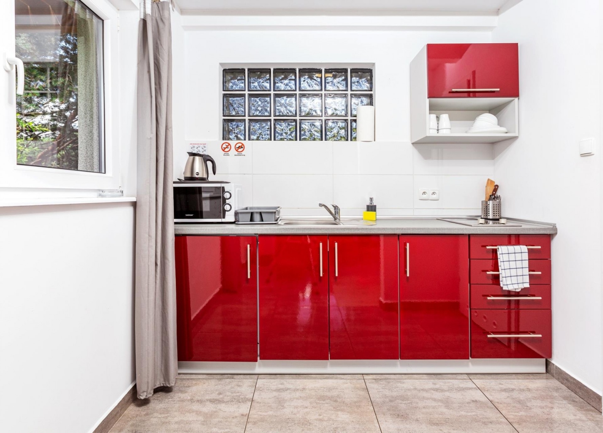 - aneksu kuchennego, w którym znajdują się wszystkie niezbędne sprzęty takie jak lodówka, czajnik elektryczny, mikrofalówka oraz płyta kuchenna. Aneks wyposażyliśmy również w garnki, a także zestaw naczyń i sztućców