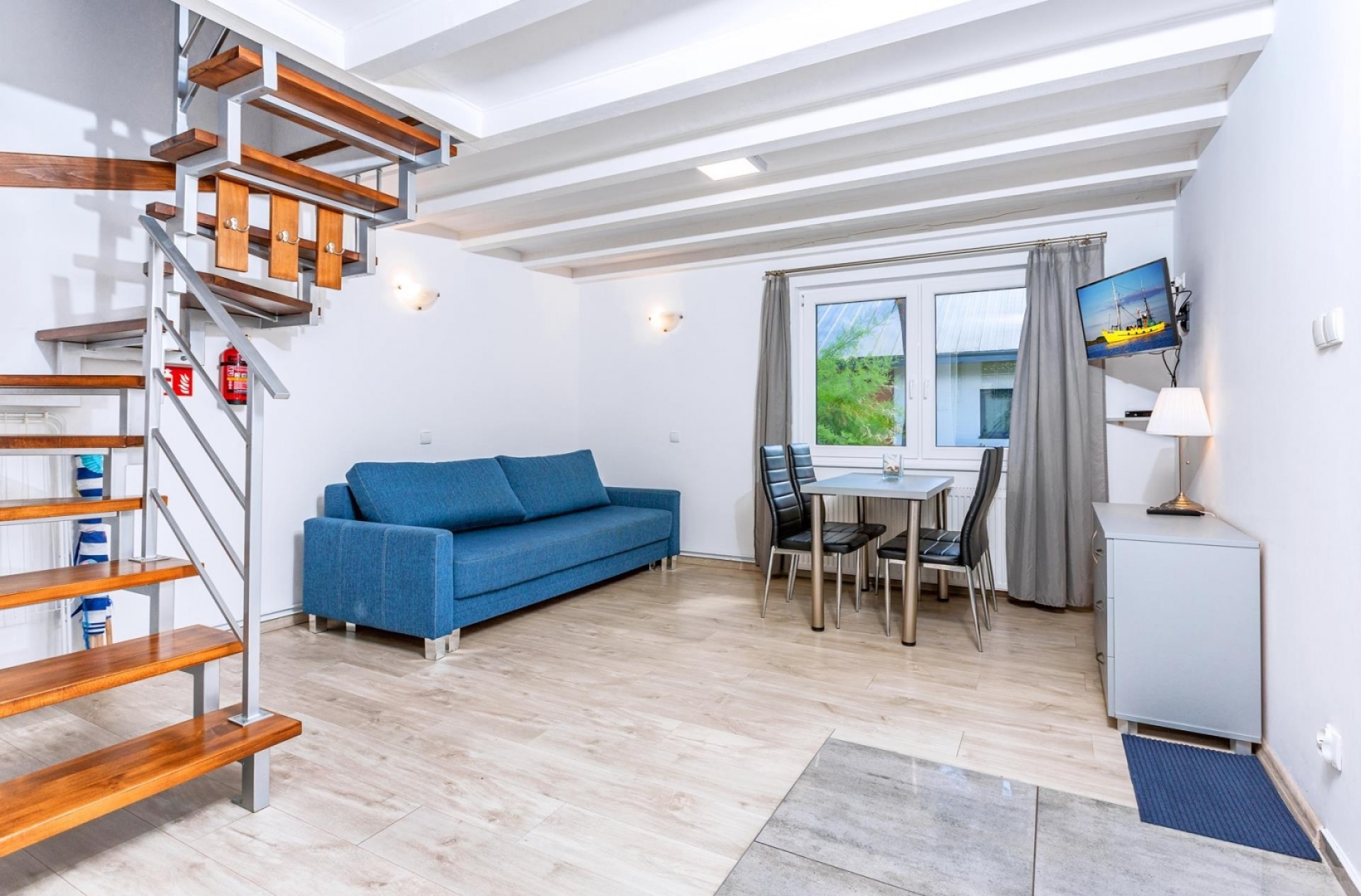- salon z rozkładaną sofą, telewizorem oraz stołem i kompletem krzeseł.