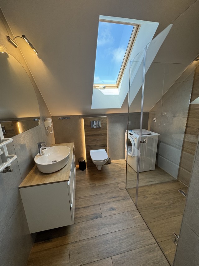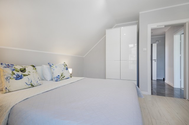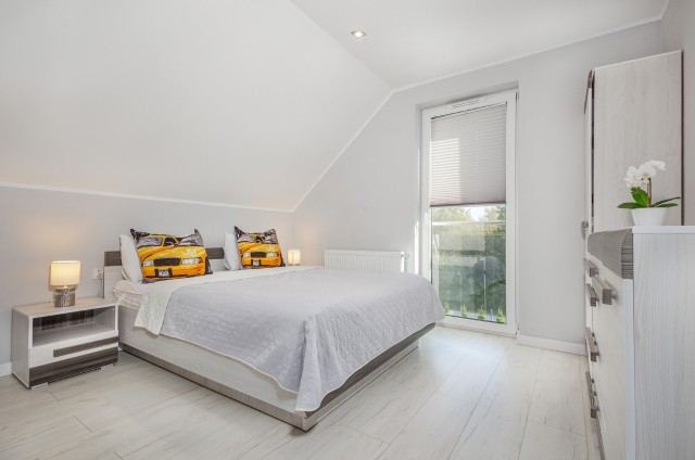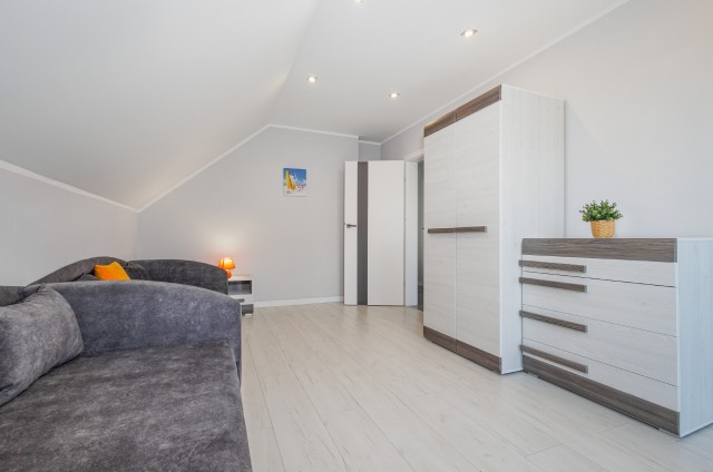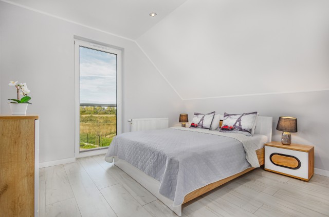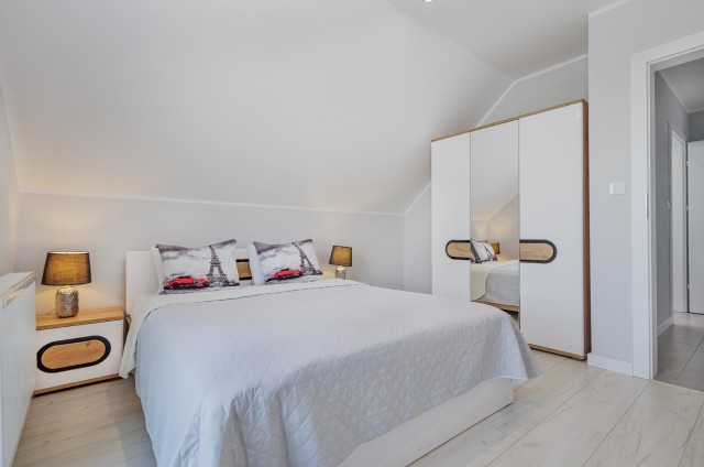 Jeśli lubicie dużą przestrzeń i bliskość natury, jesteśmy pewni, że nasze apartamenty spełnią Wasze oczekiwania. Każdy domek ma powierzchnię 77m2 i jest przeznaczony dla maksymalnie ośmiu osób. Na zewnątrz znajduje się przestronny taras z grillem i wygodnym kompletem wypoczynkowym do dyspozycji Gości. W każdym z obiektów na piętrze usytuowane są dwie wyposażone sypialnie , pierwsza z łożem małżeńskim, druga- z 2 sofami ( gdzie mogą spać 4 osoby) oraz łazienka z prysznicem. Na parterze znajduje się salon z narożnikiem , aneksem kuchennym oraz WC z umywalką. Każdy z apartamentów wyposażony jest w żelazko z deską, suszarkę do włosów, ręczniki kąpielowe, parawan i koc na plażę.