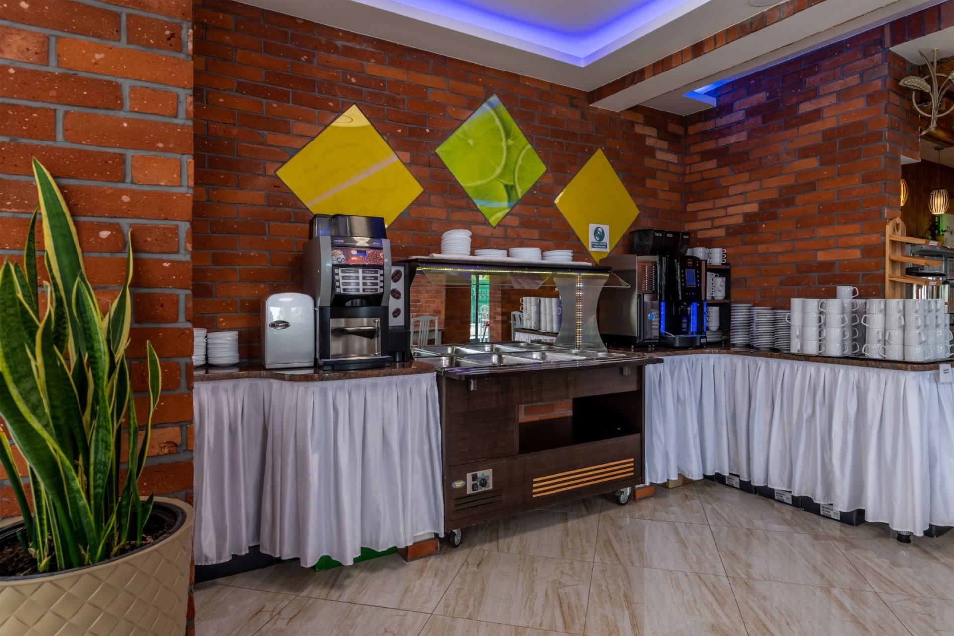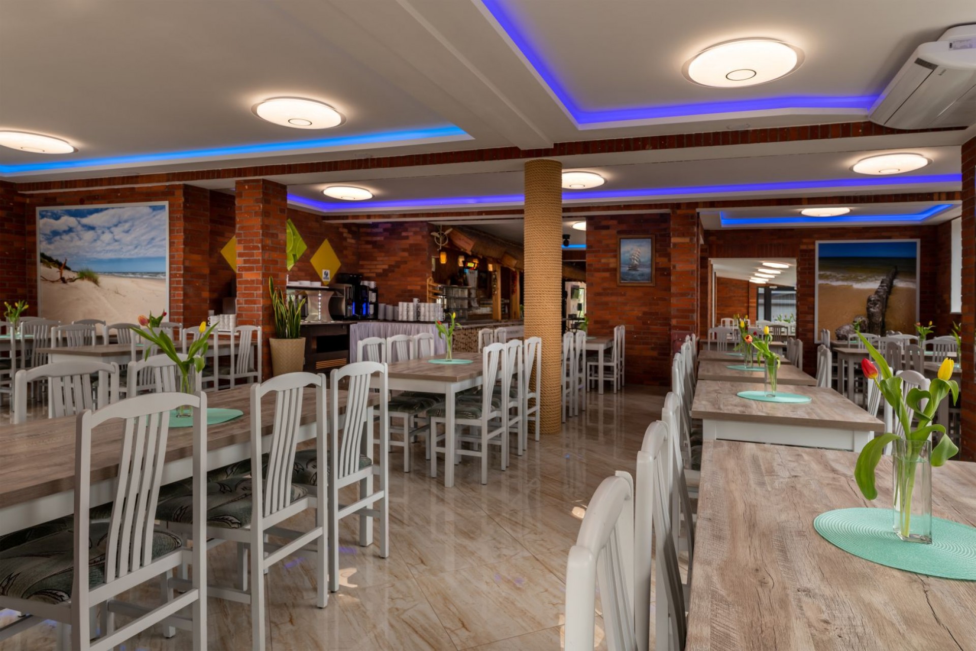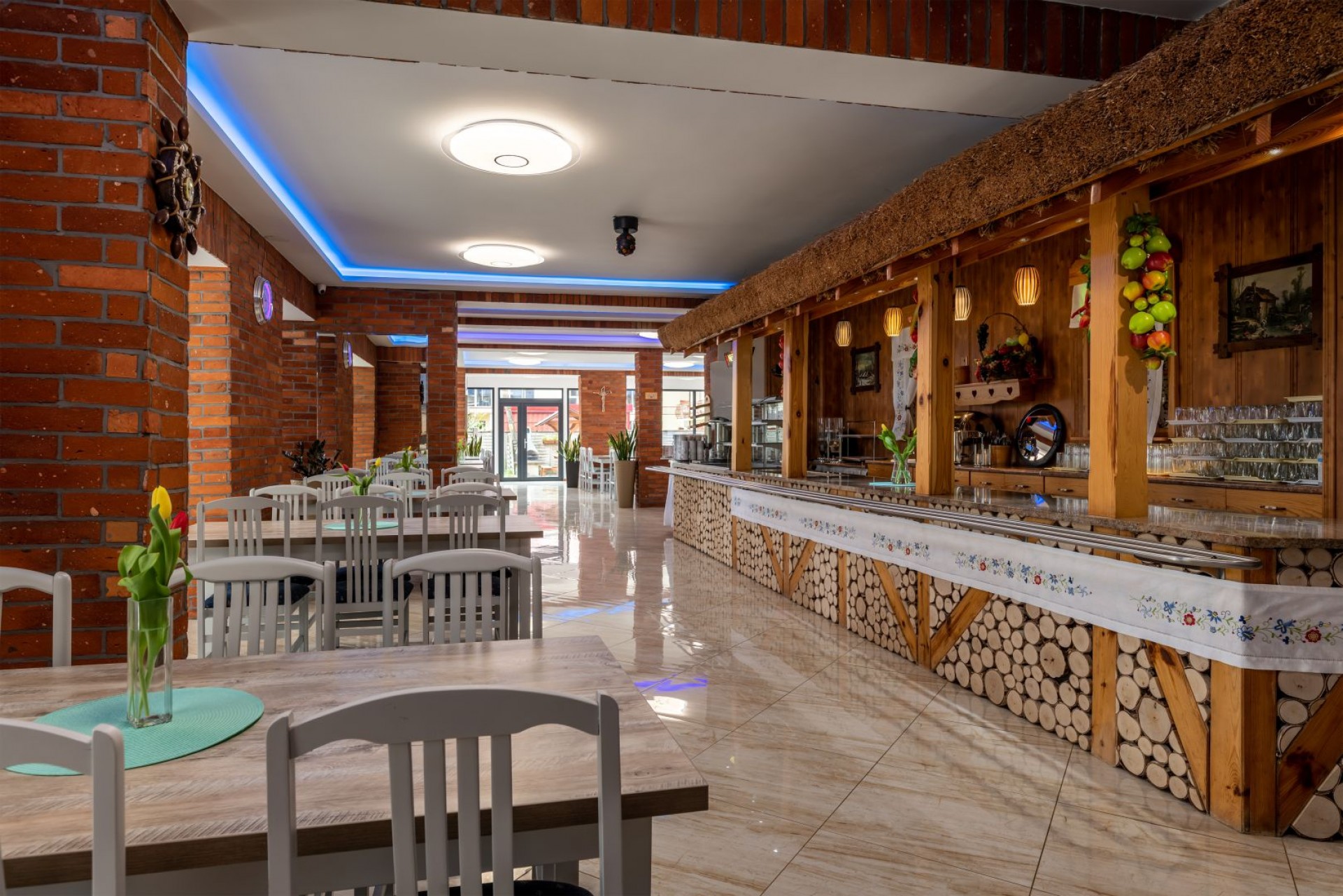 Prowadzimy także restaurację , w której serwujemy smaczne i urozmaicone śniadania w postaci szwedzkiego stołu oraz domowe obiady serwowane , tzw. danie dnia , pełny obiad , deser napój , kawa .