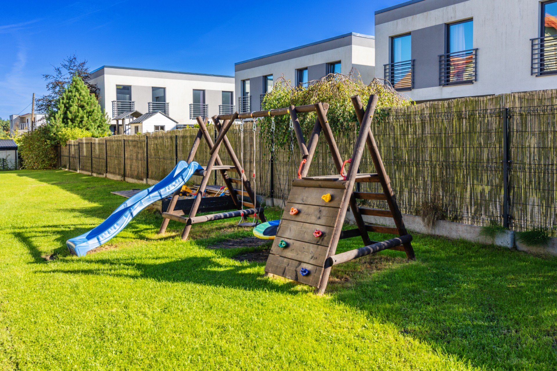 Plac zabaw z huśtawką, zjeżdżalnią, drabinkami, i piaskownicą,