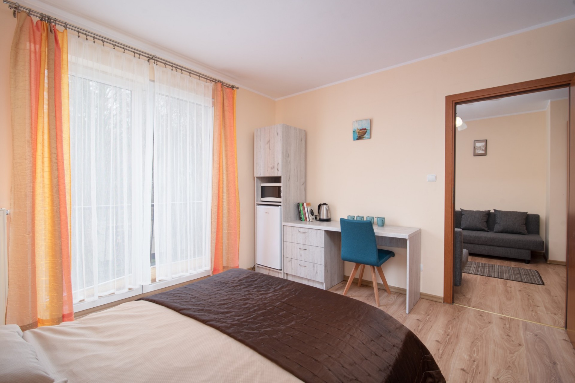 Oferujemy Państwu 1, 2, 3, 4 - osobowe pokoje z łazienką, suszarką, TV, lodówką, balkonem i naczyniami, w tym również warianty składające się z dwóch pokoi. W każdym pokoju dodatkowo przewidzieliśmy tzw. - dostawkę.